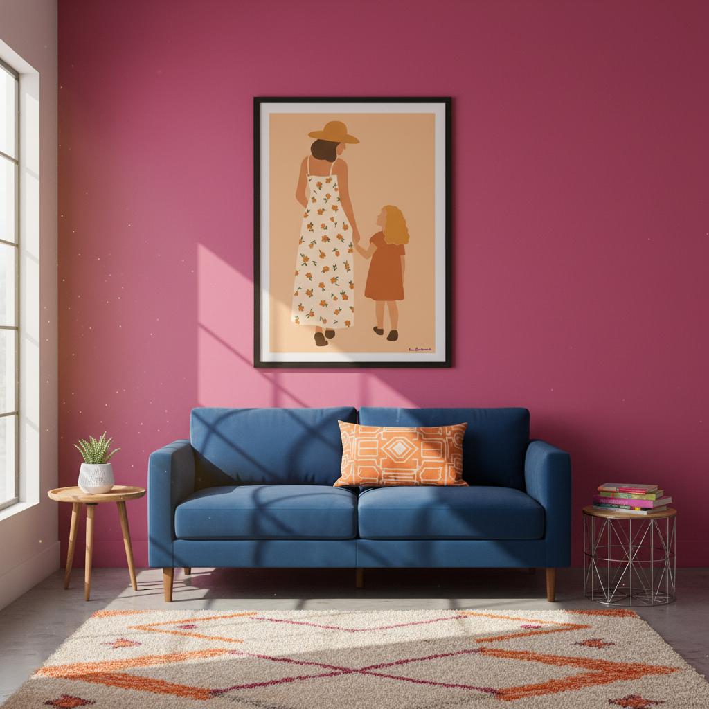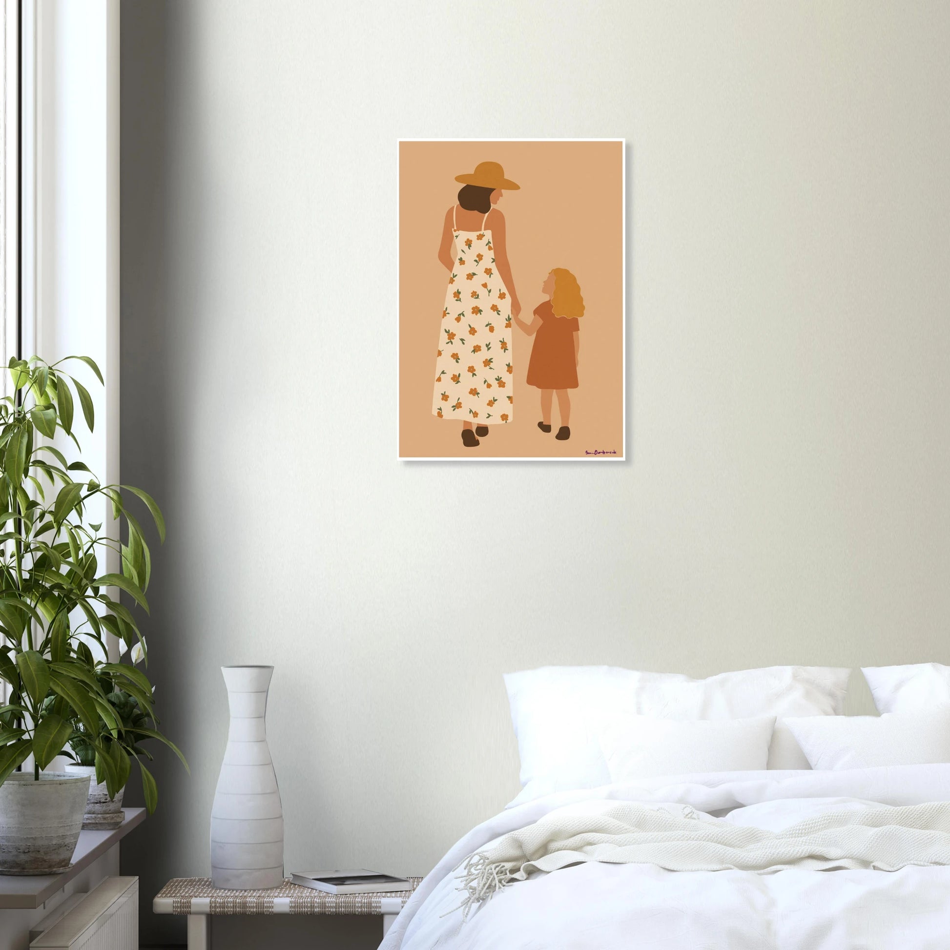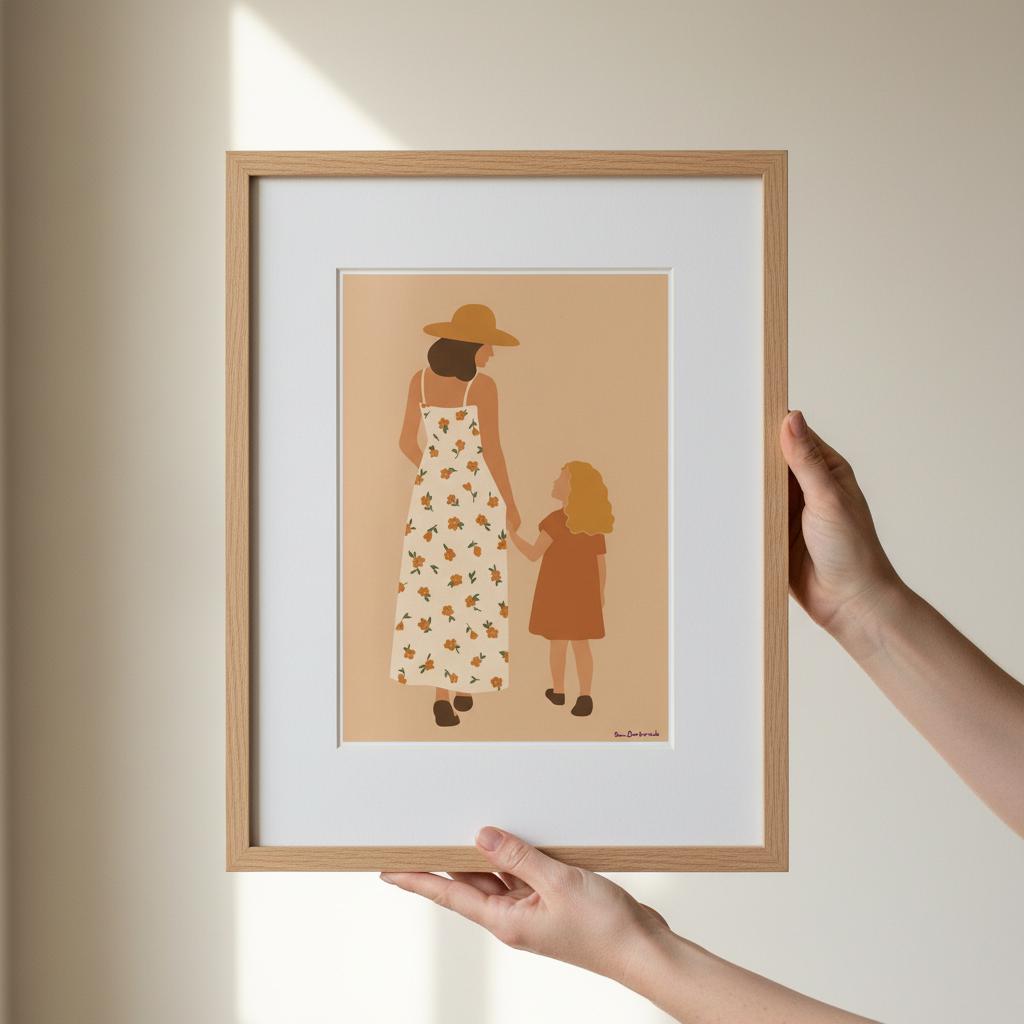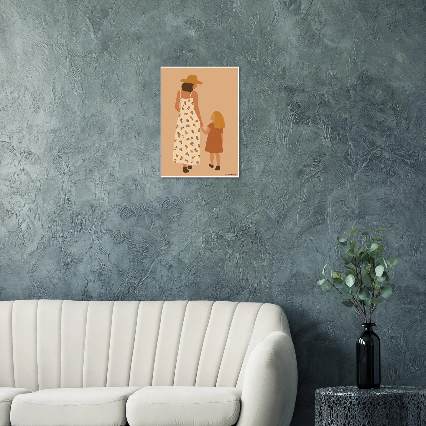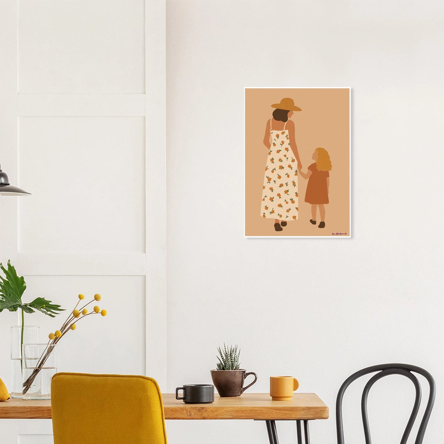 Illustrasjonen fanger et stille øyeblikk av nærhet – en tidløs sommerdag der alt handler om å være sammen. De myke fargetonene i beige, oker og terrakotta gir bildet en rolig og harmonisk stemning, perfekt til både stue, barnerom eller hytteveggen.