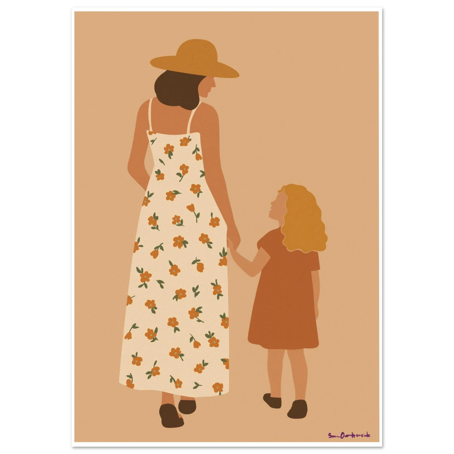 En mor og datter går hånd i hånd under den varme sommersolen. Moren bærer en lys kjole med små blomster og en bredstråhatt, mens den lille jenta i rustrød kjole ser opp på henne med tillit og undring.