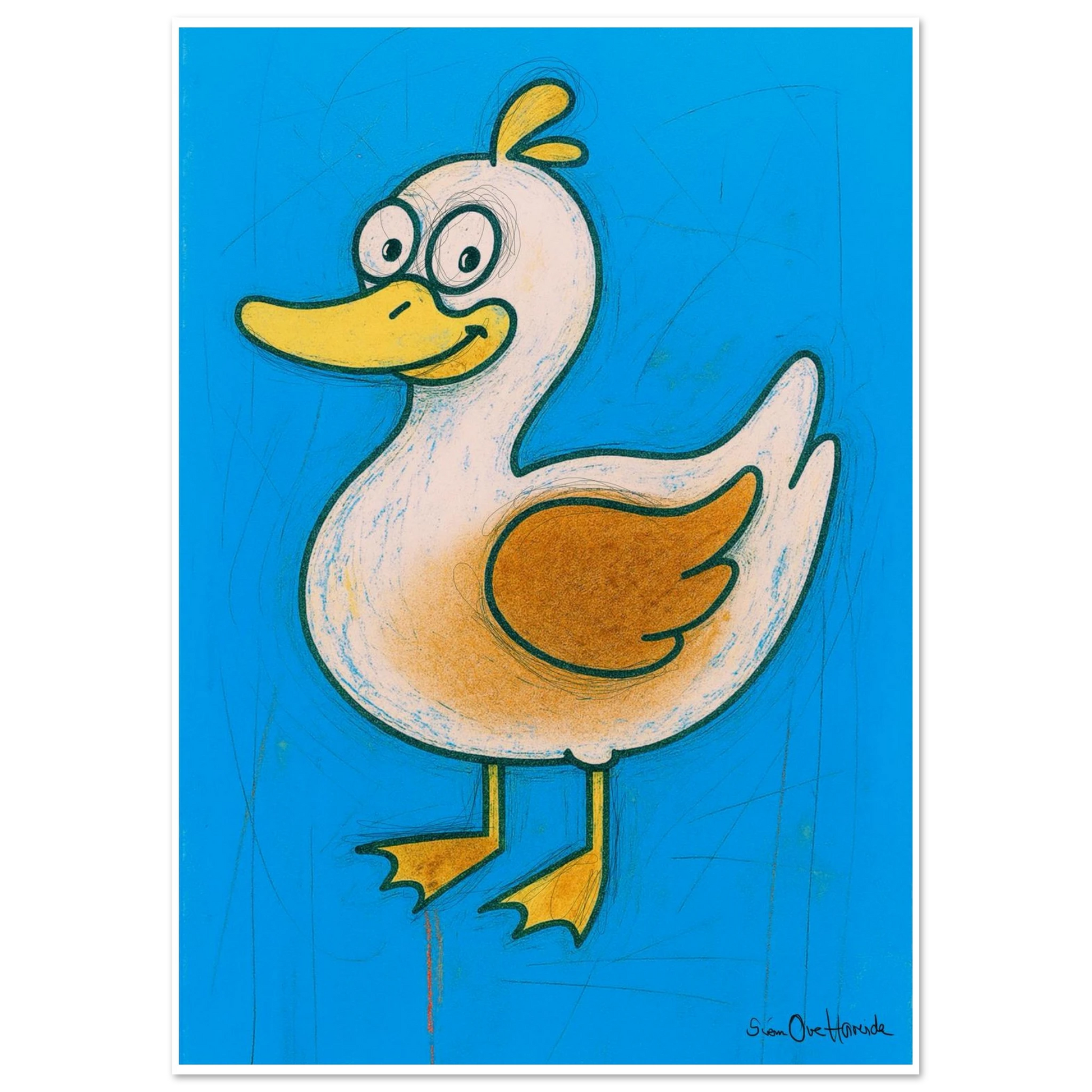 Dette er et sjarmerende og humoristisk maleri av en and i en naivistisk stil. Anden er malt i hvitt med en lang, bred gul nebb og et lurt smil. Den har store, runde øyne som gir den et morsomt og livlig uttrykk. På toppen av hodet sitter en liten gul fjærtopp som minner om en hårlokk.