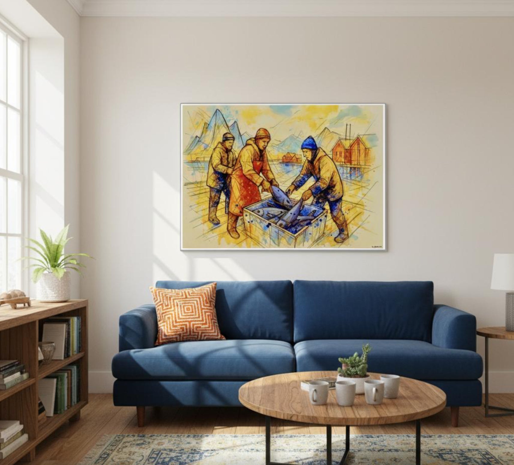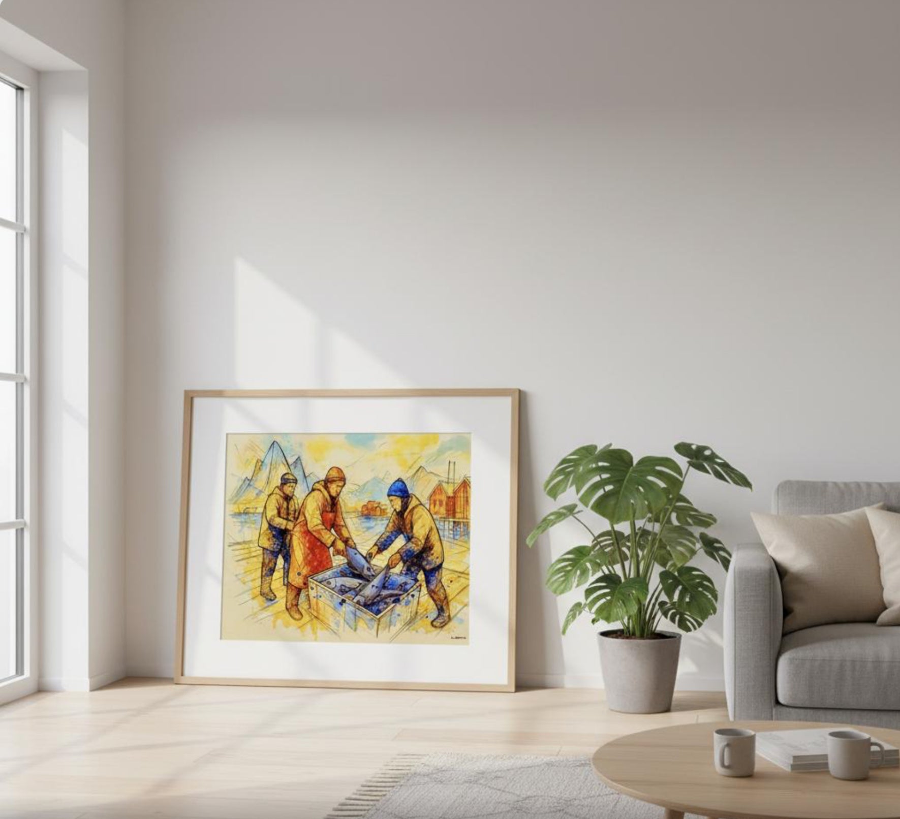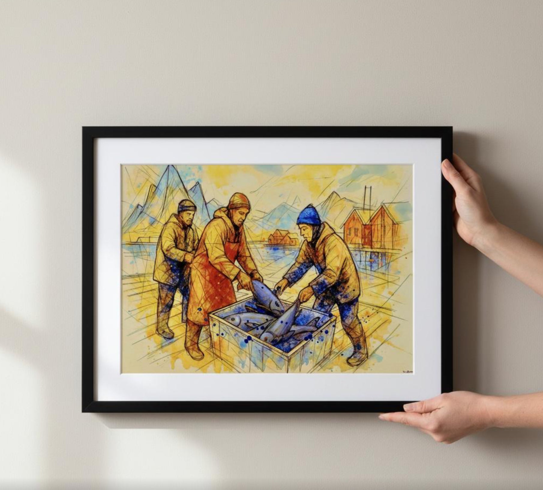 Dette fargerike kunsttrykket skildrer tre fiskere i full sving med dagens fangst, der store fisk legges i kasser på kaien. Motivet fanger essensen av kystens arbeidsliv – fellesskapet, styrken og naturens nærhet.