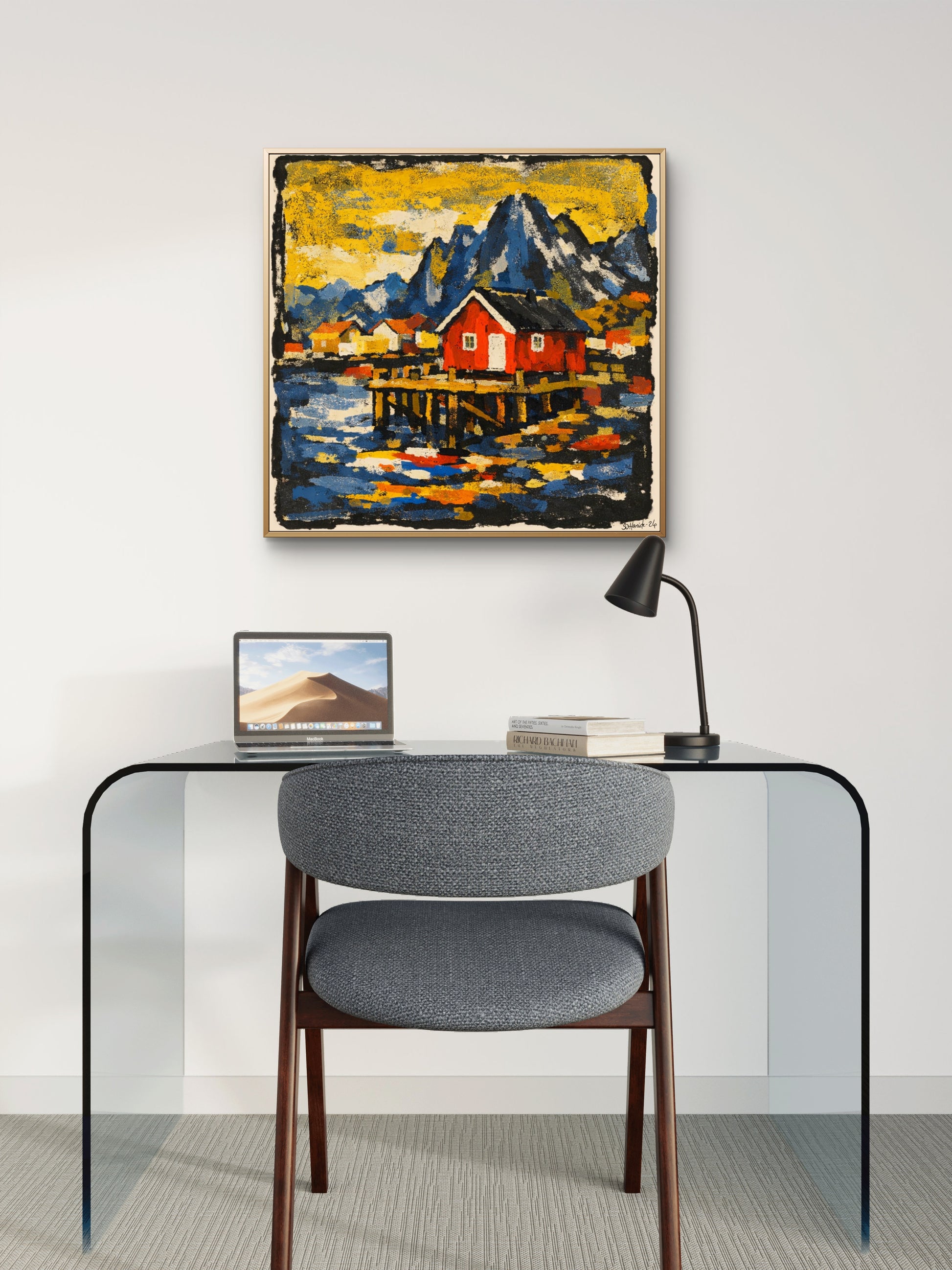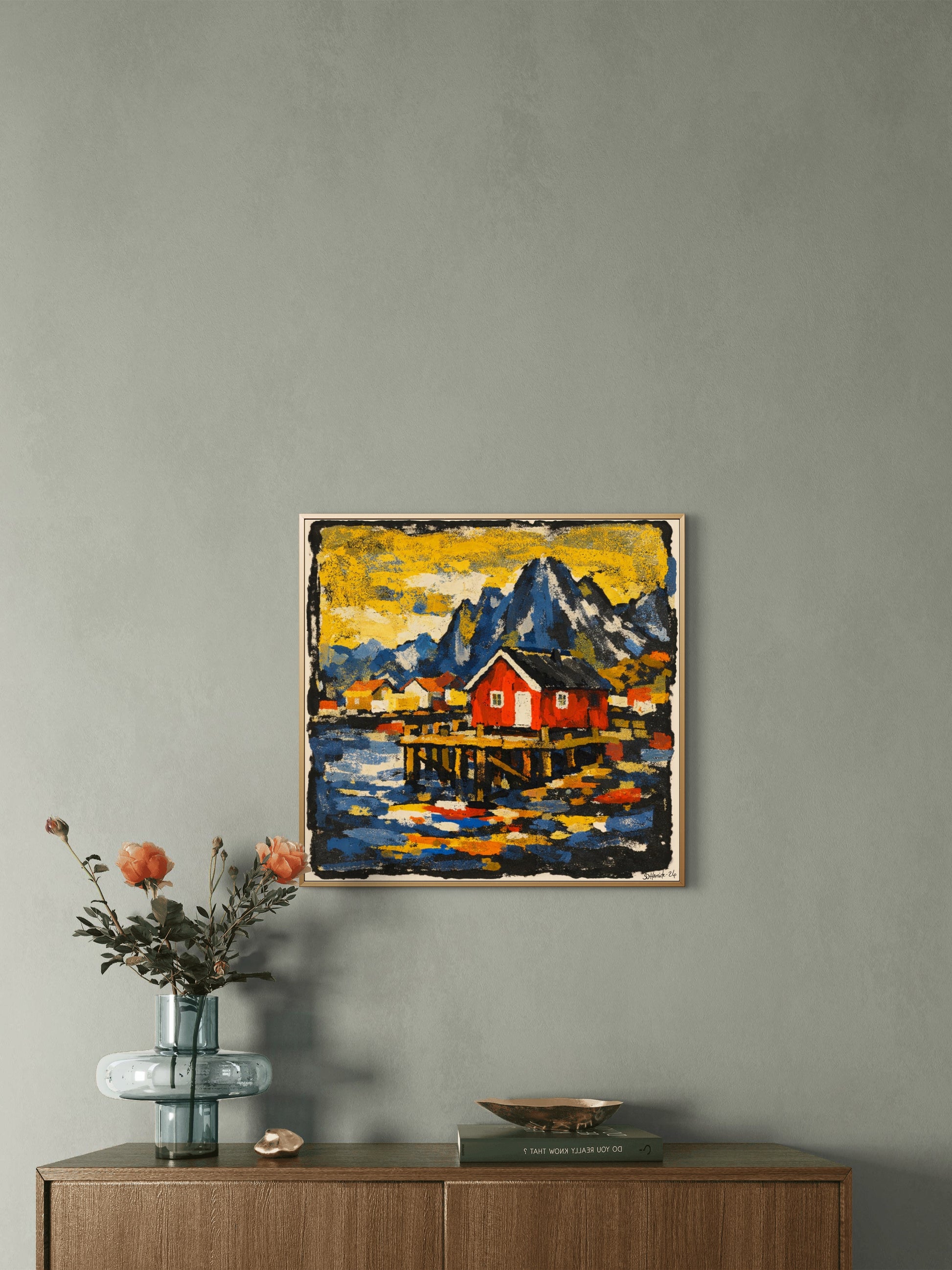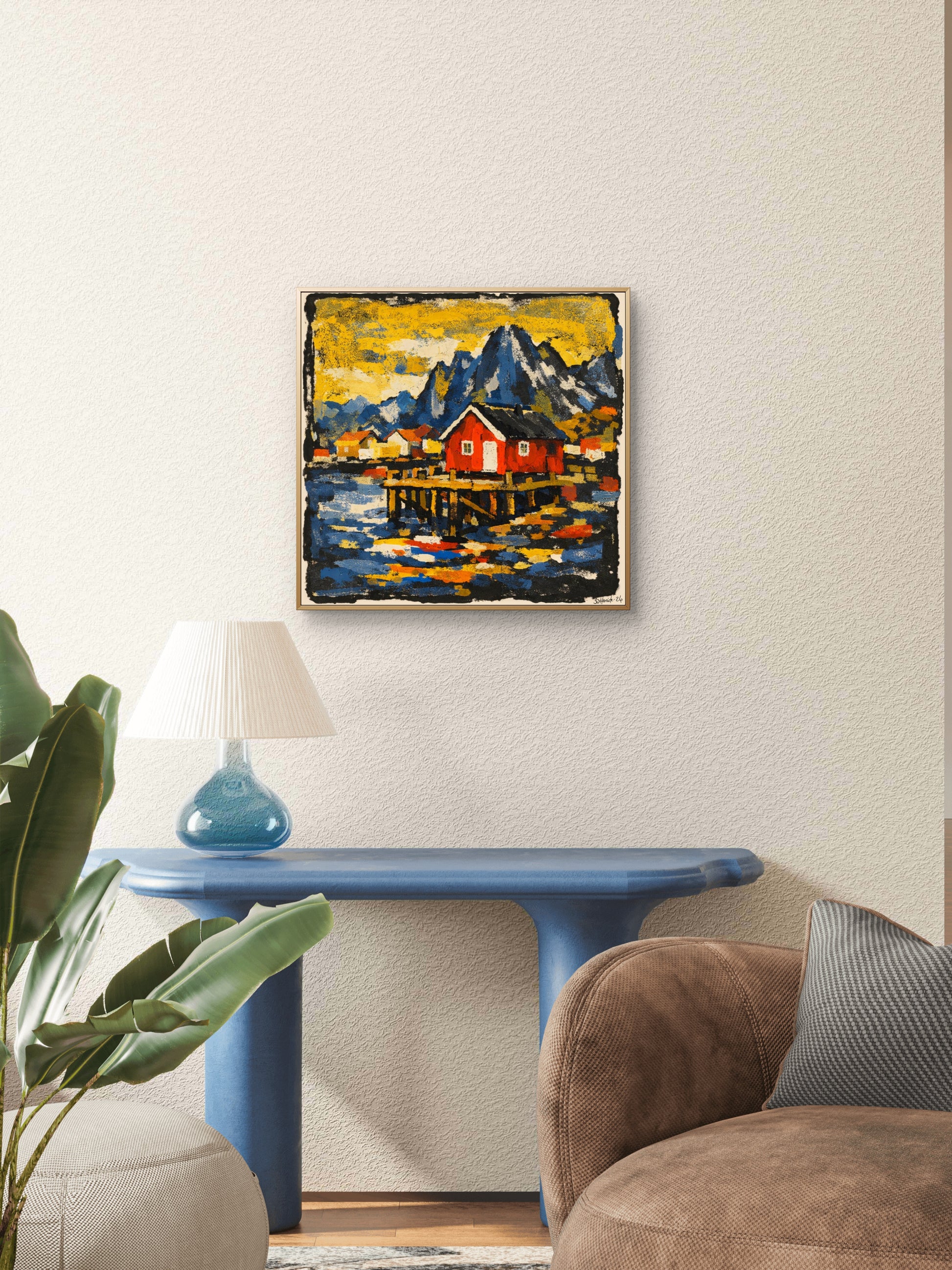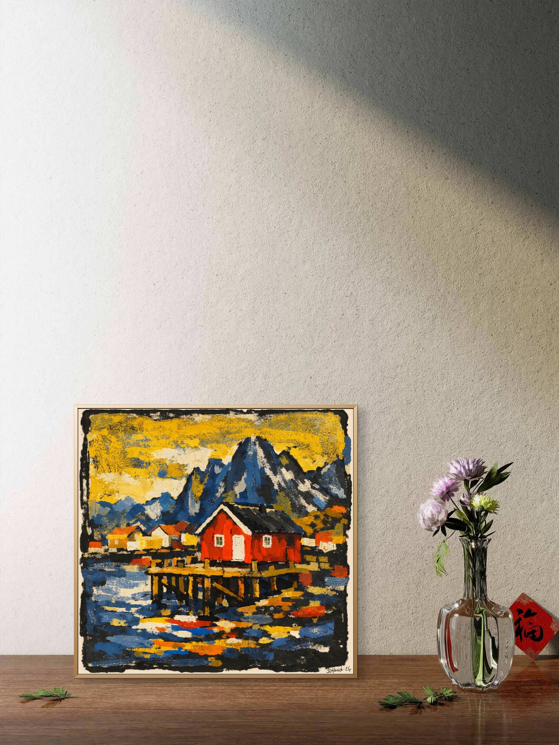Dette kunstverket er en hyllest til det nordlige landskapet – der fjellene reiser seg mørke og majestetiske, havet speiler lyset, og den røde rorbua står som et stille anker i alt som beveger seg.