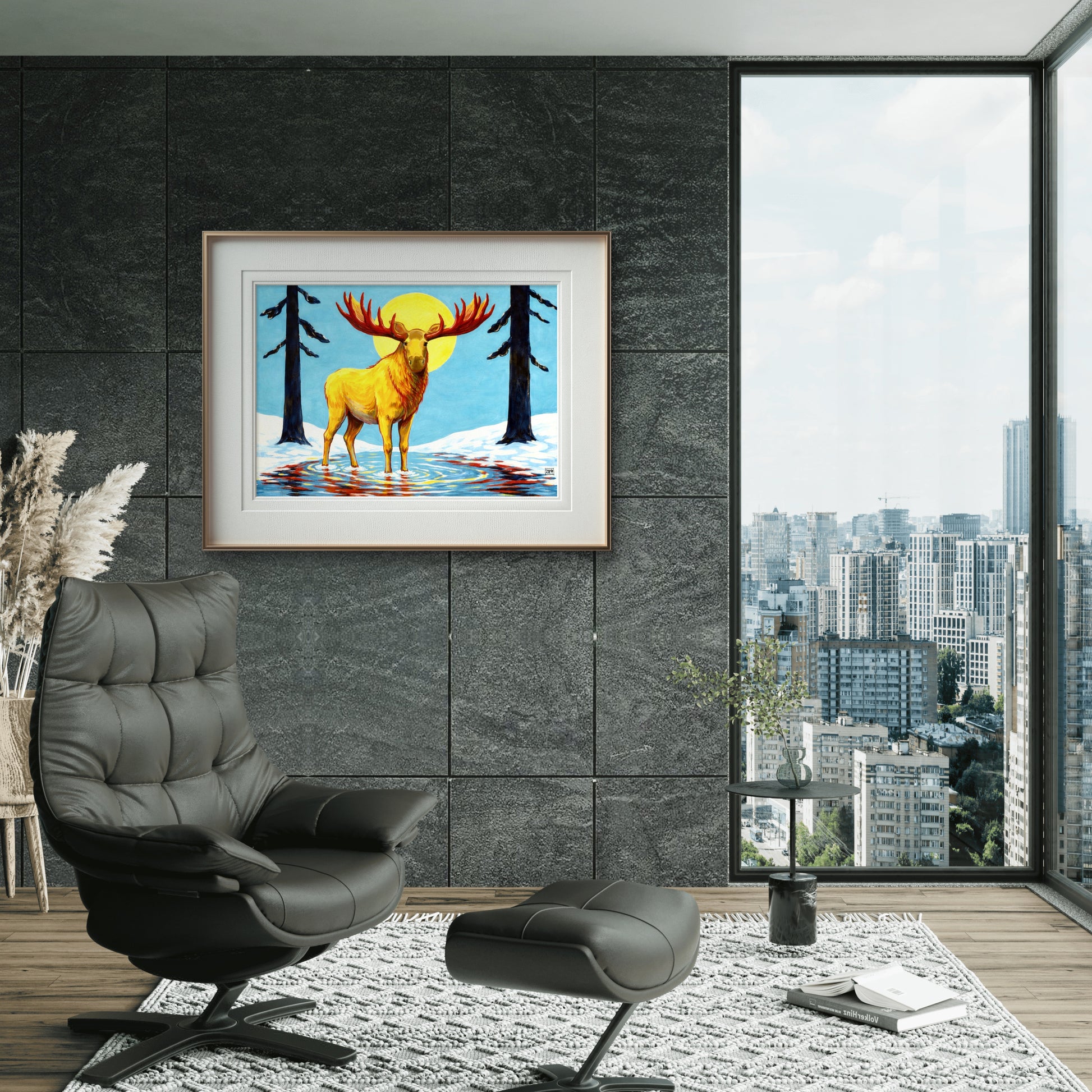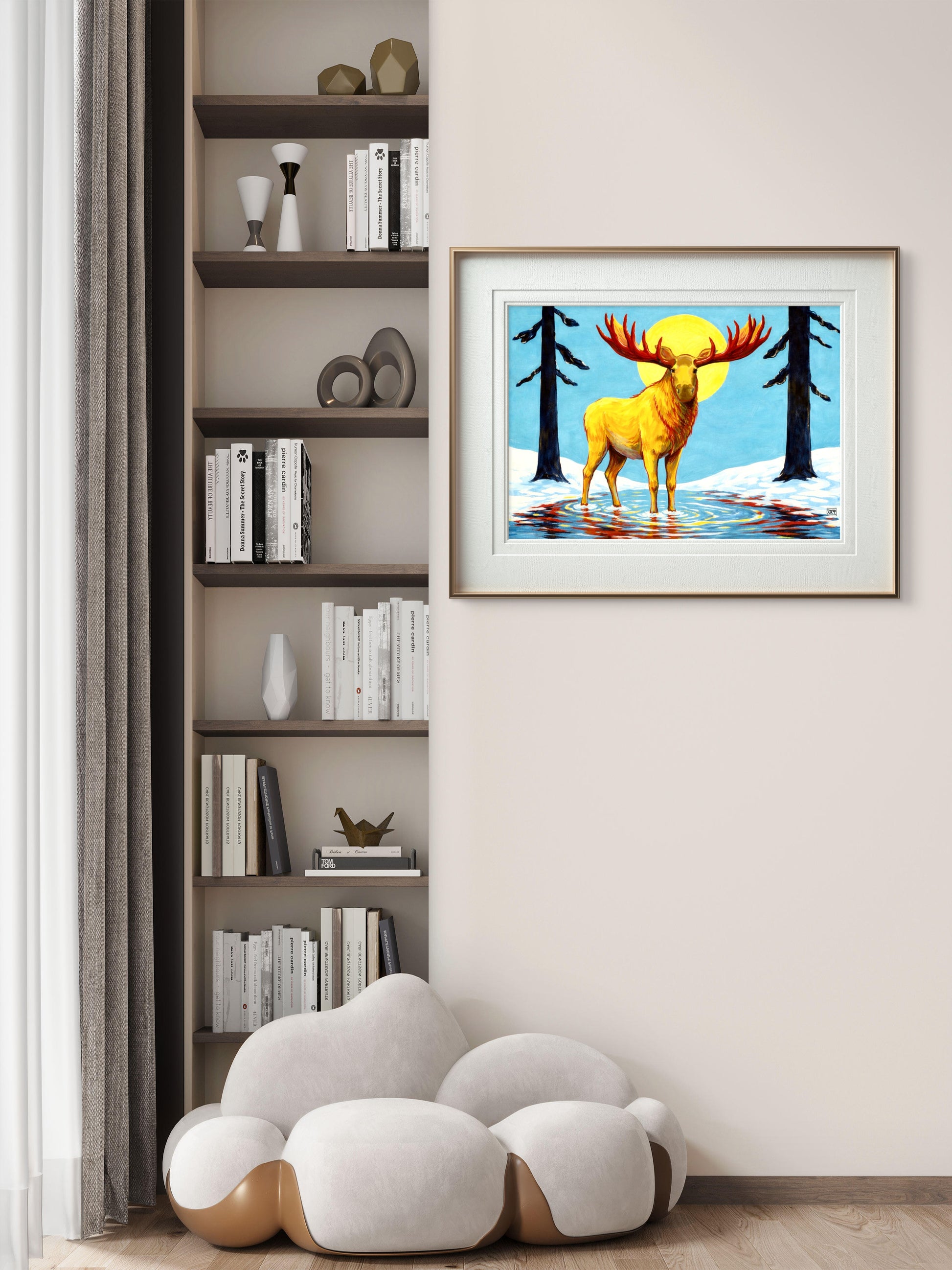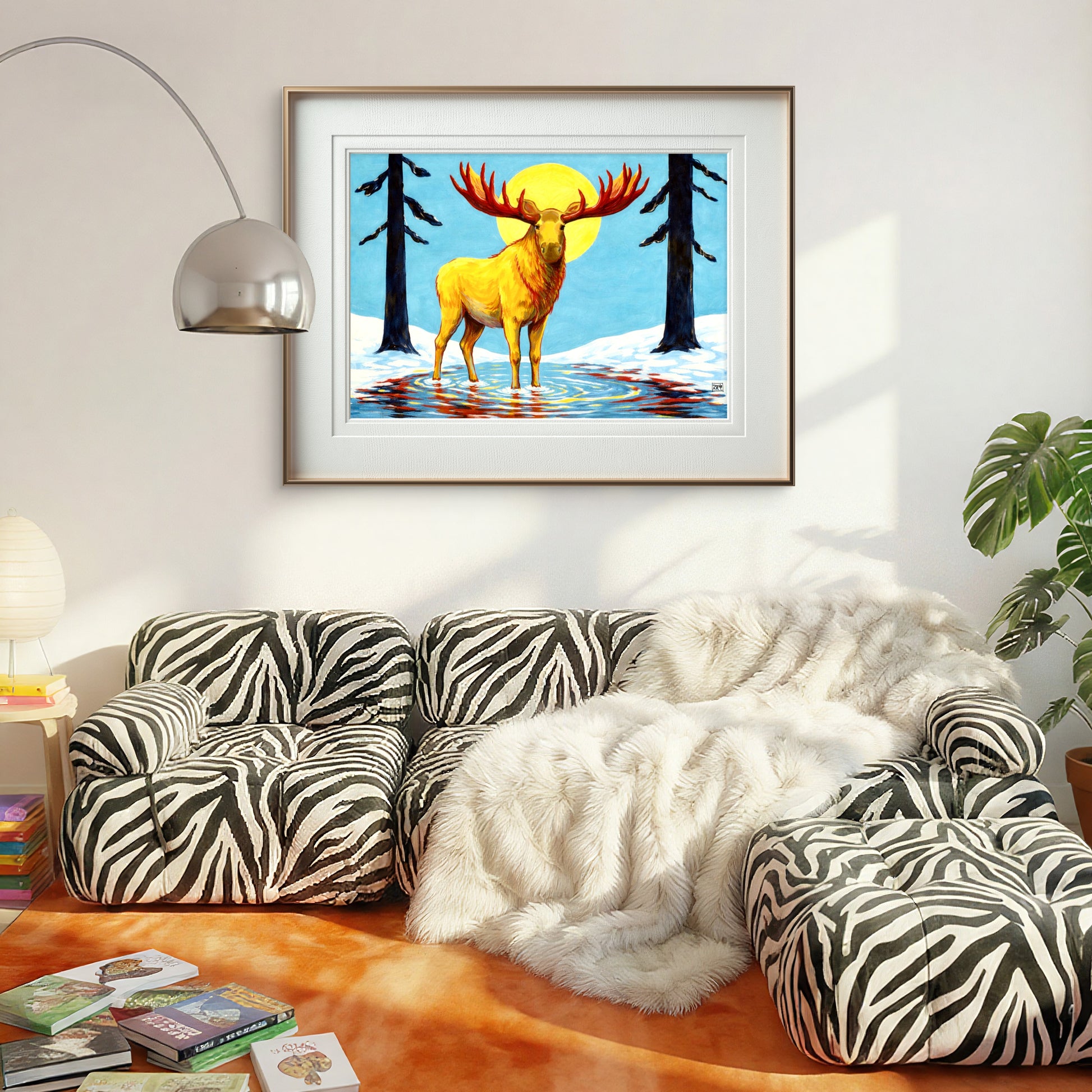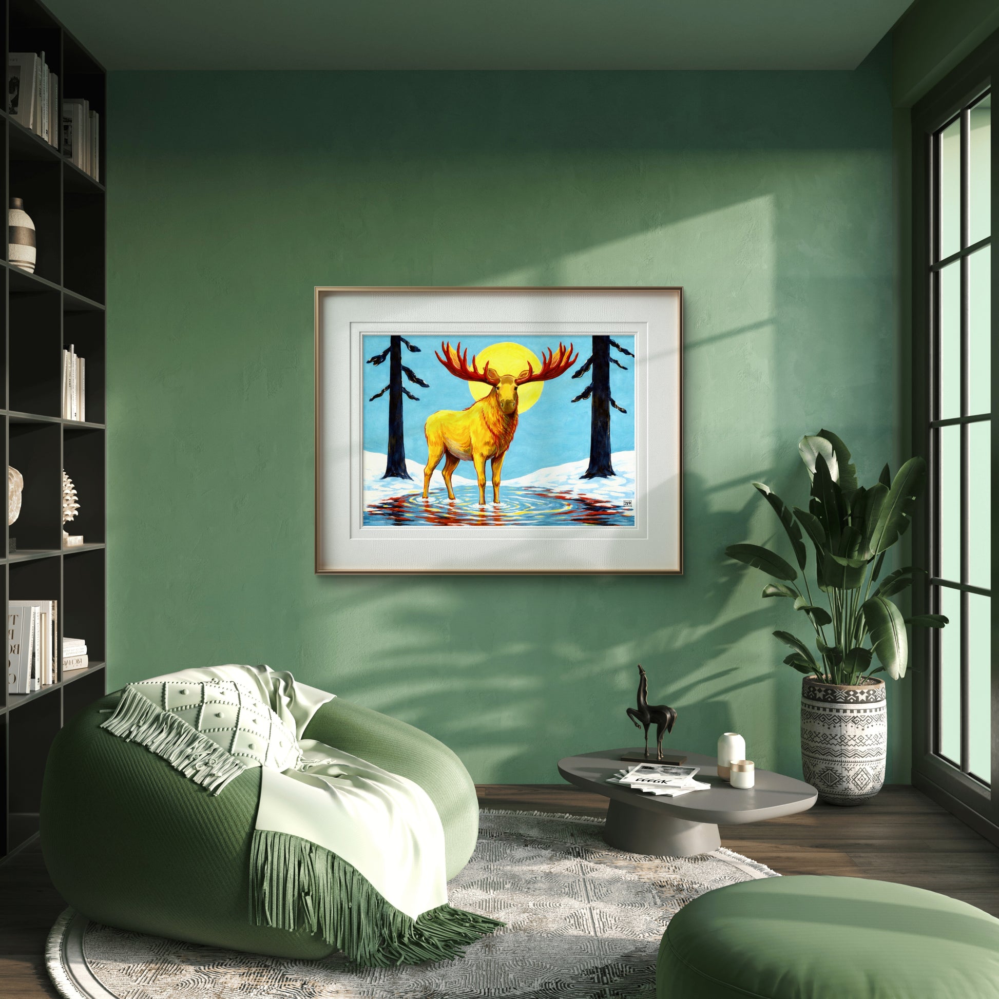 En gyllen elg står stille i det iskalde vannet, badet i et varmt sollys som danner en glorie bak geviret. Kontrasten mellom kulde og glød skaper et poetisk øyeblikk av ro, styrke og nordisk mystikk.