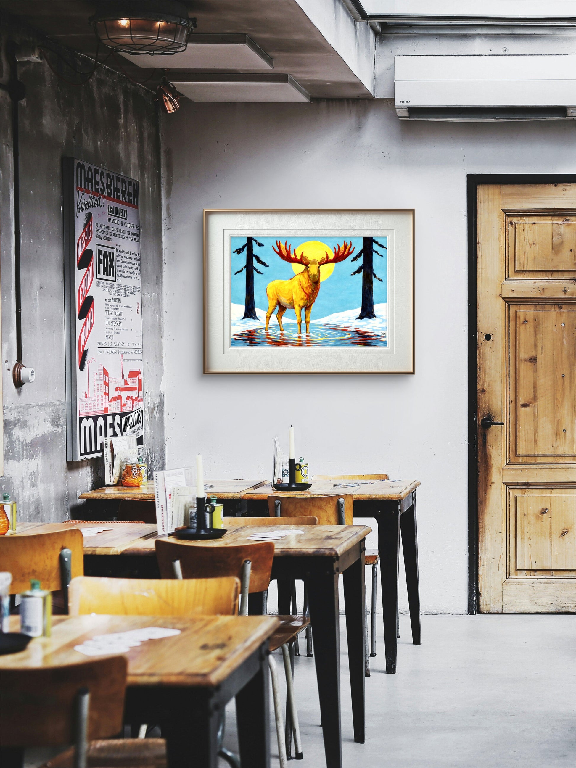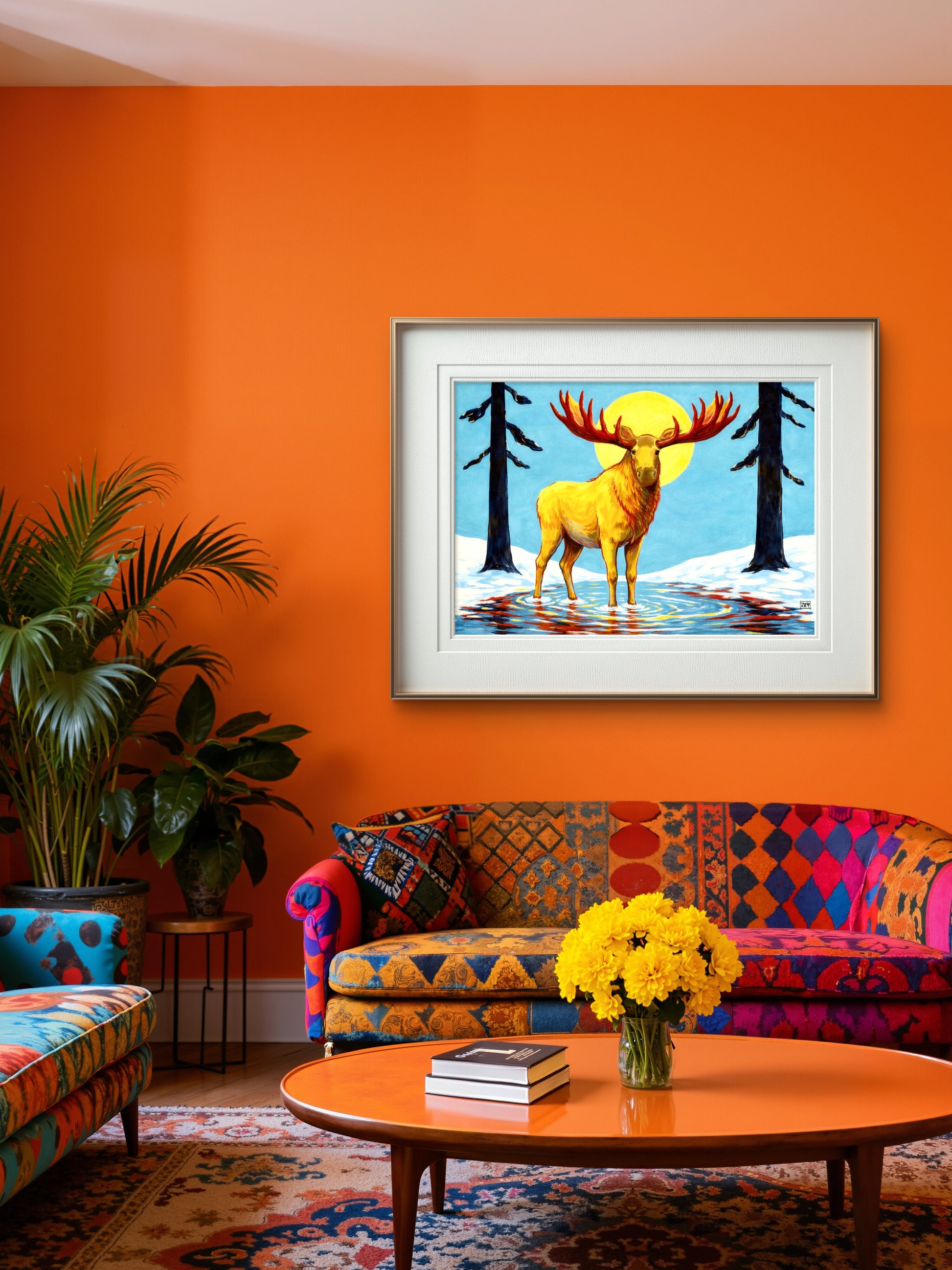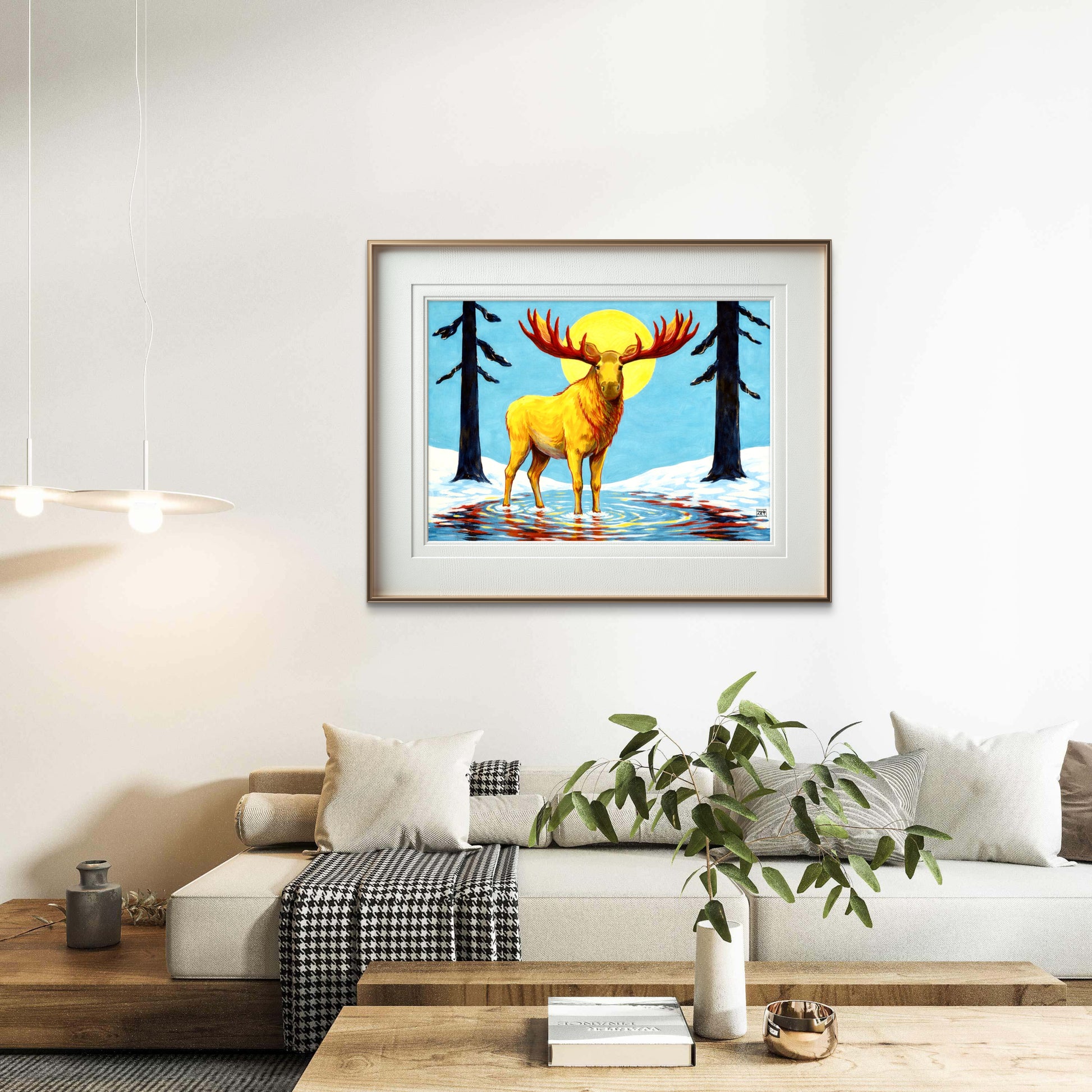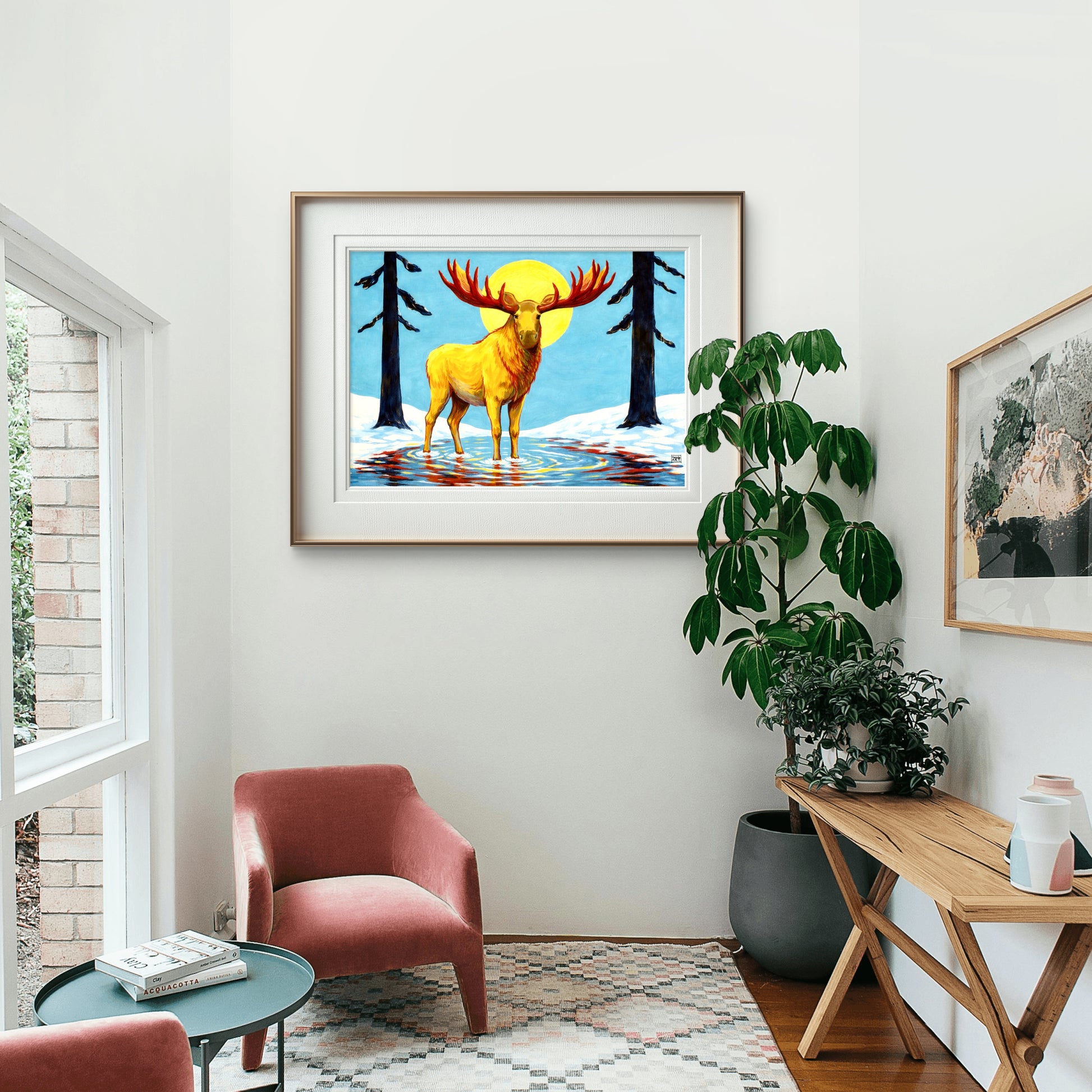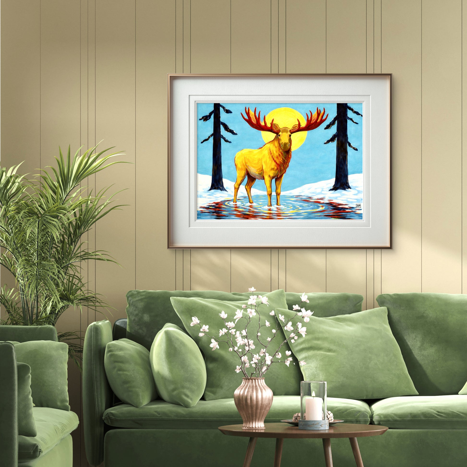 En gyllen elg står stille i det iskalde vannet, badet i et varmt sollys som danner en glorie bak geviret. Kontrasten mellom kulde og glød skaper et poetisk øyeblikk av ro, styrke og nordisk mystikk.