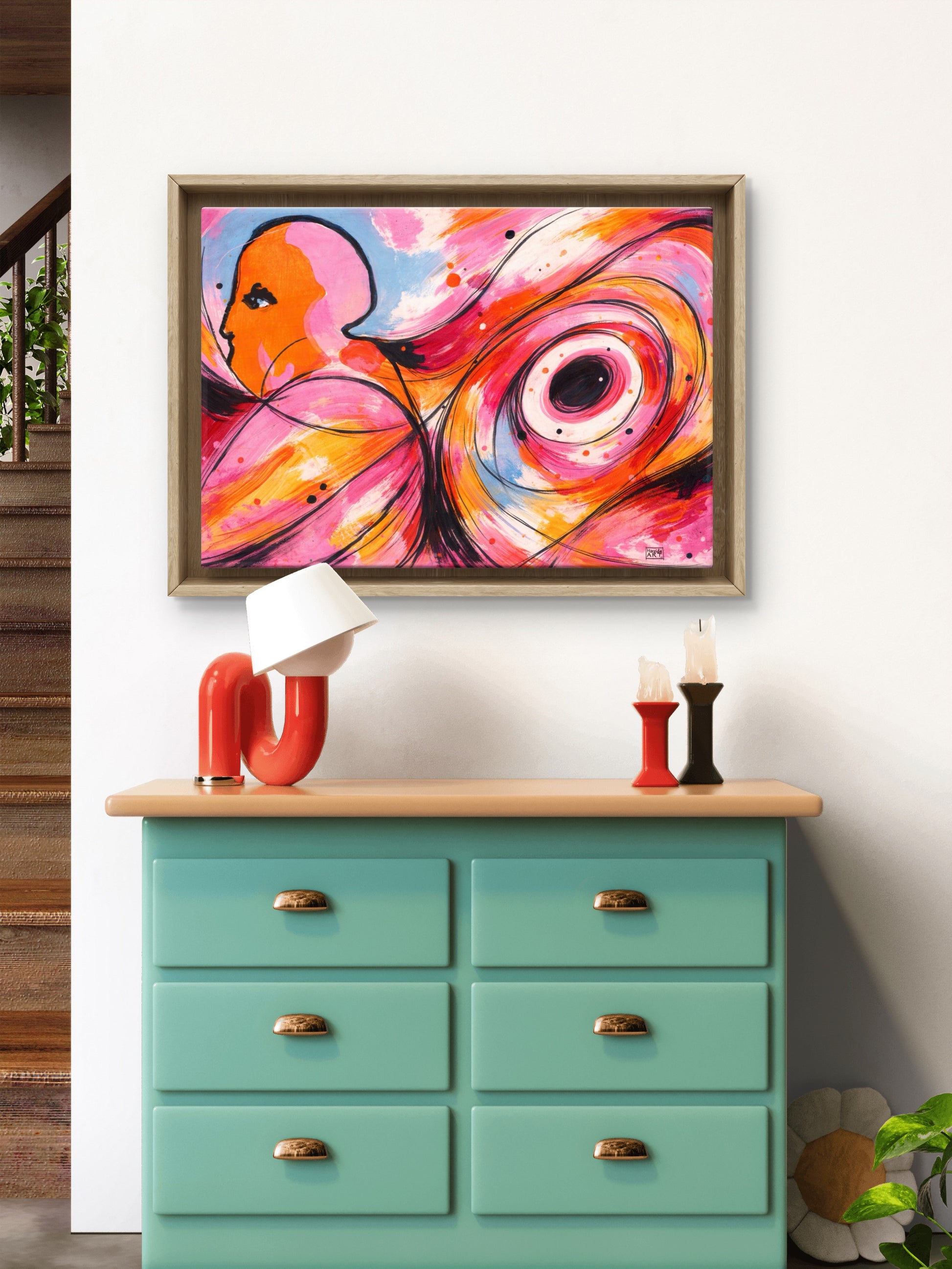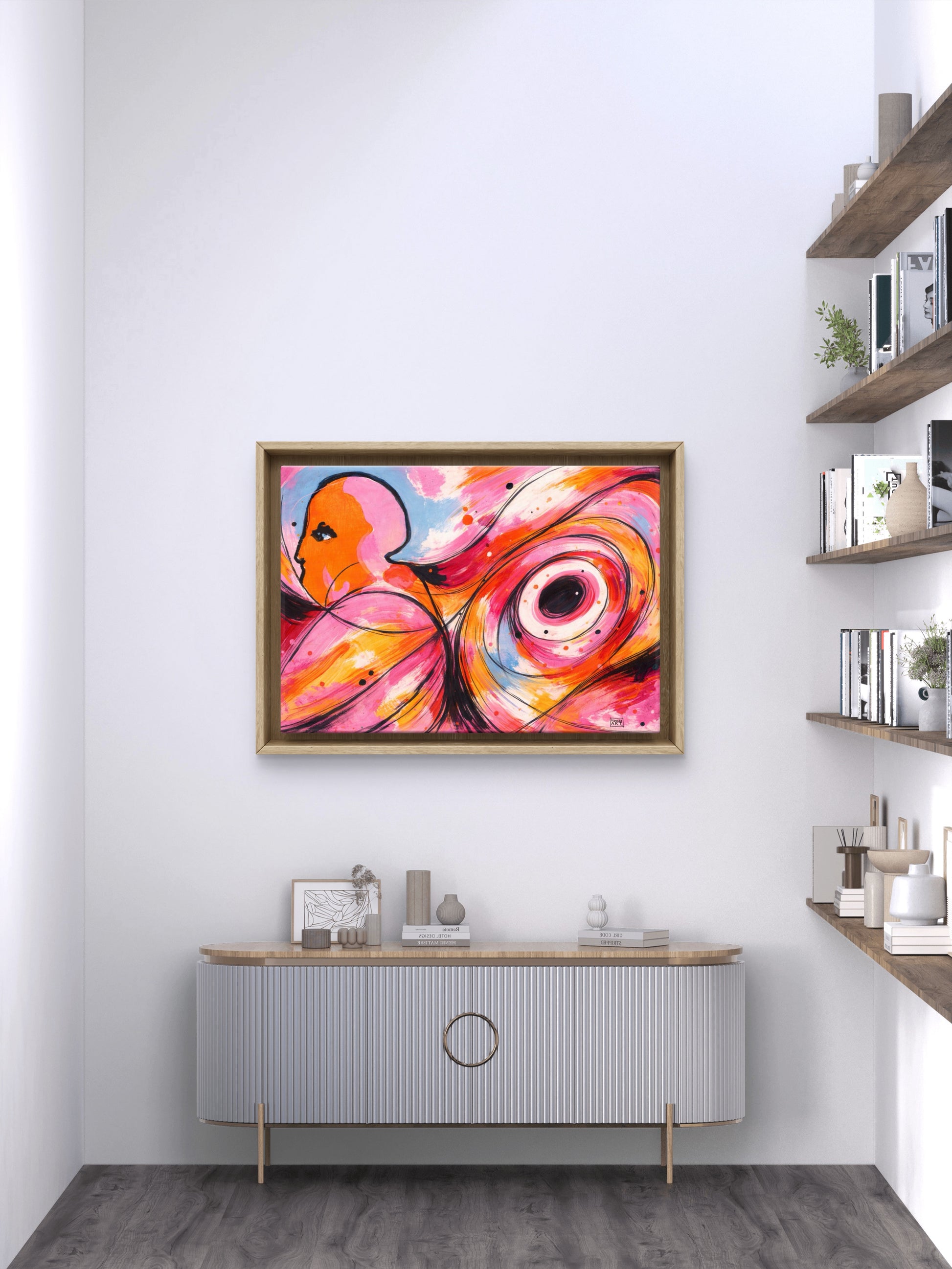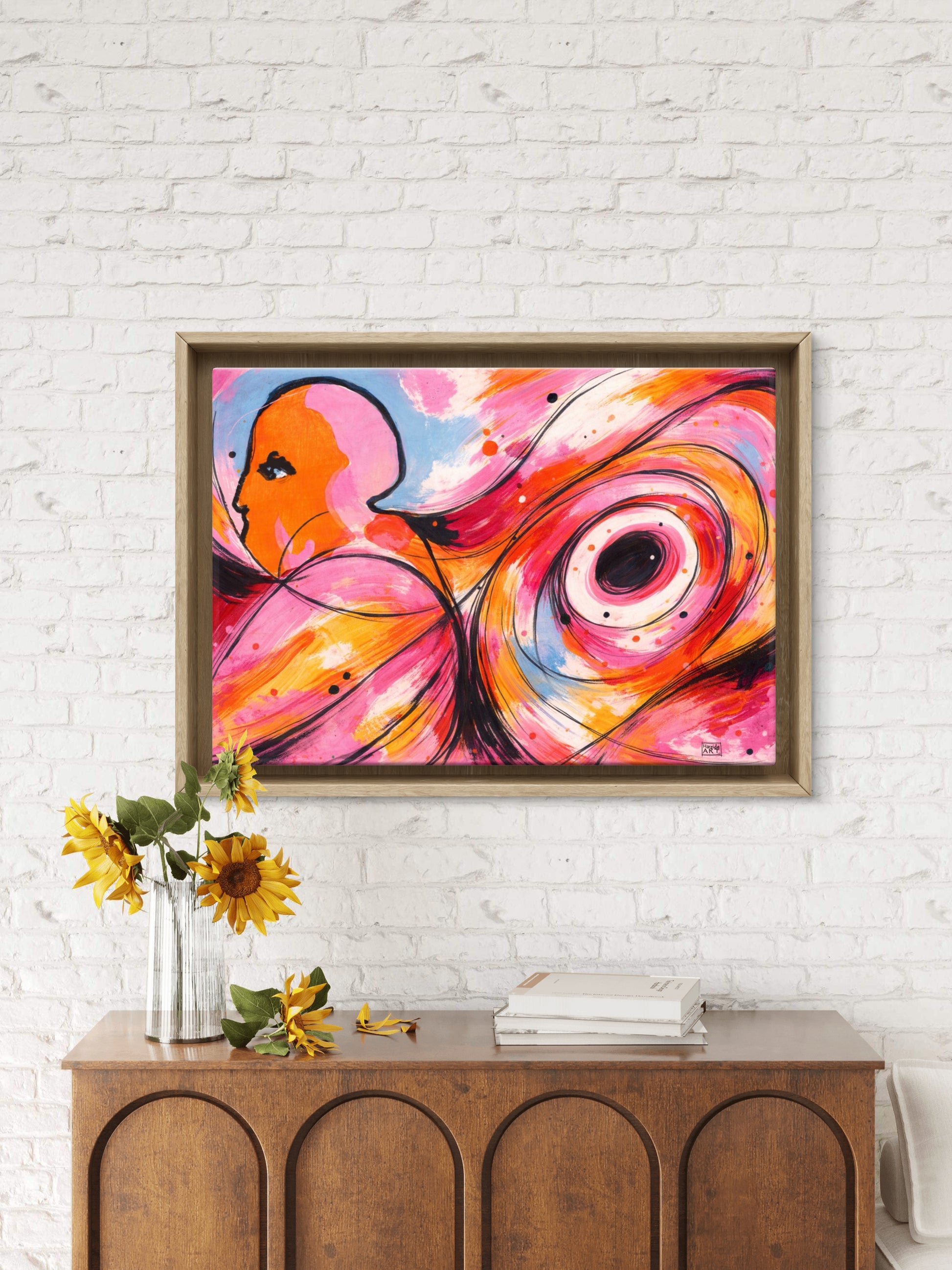 Dette abstrakte, ekspressive maleriet skildrer et ansikt i profil som smelter sammen med flytende tidligere og virvlende bevegelser. Erotiske rosatoner, varme oransje flater og myke blå nyanser bindes sammen av dynamiske svarte linjer som leder blikket gjennom komposisjoner, som en indre strøm av tanker, følelser og minner.