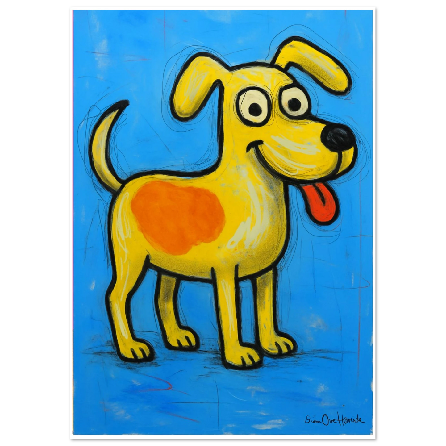 Dette er et livlig og humoristisk maleri av en hund i en naivistisk stil. Hunden er malt i sterke gule toner og står i profil mot en strålende blå bakgrunn. Den har store, runde øyne og et bredt smil, med en rød tunge som henger ut av munnen - et klassisk uttrykk for en glad og leken hund.