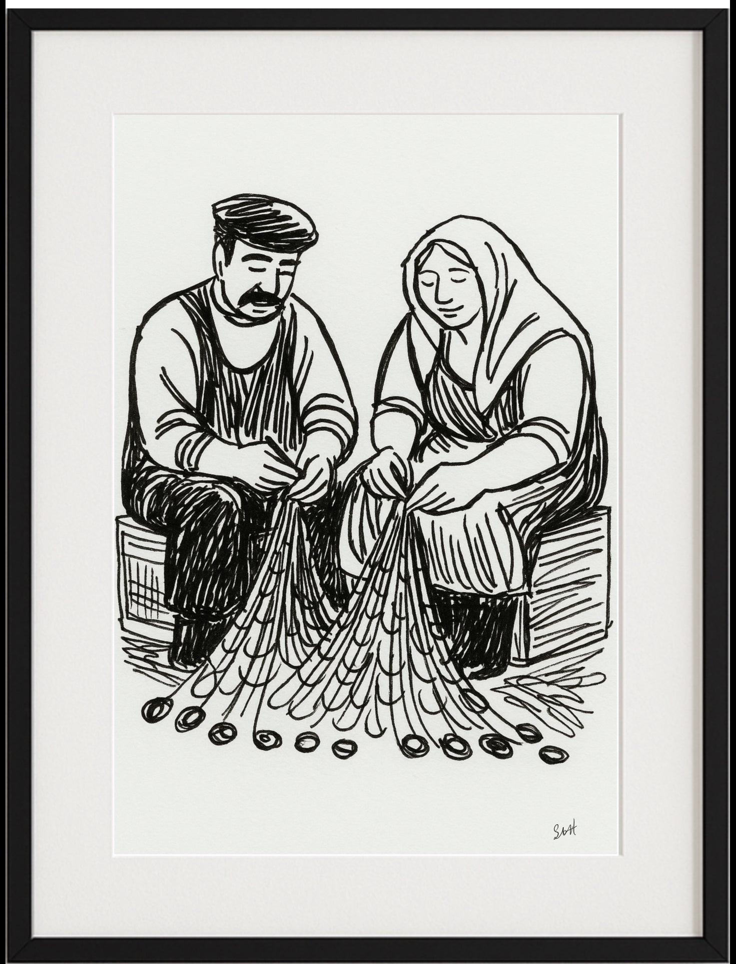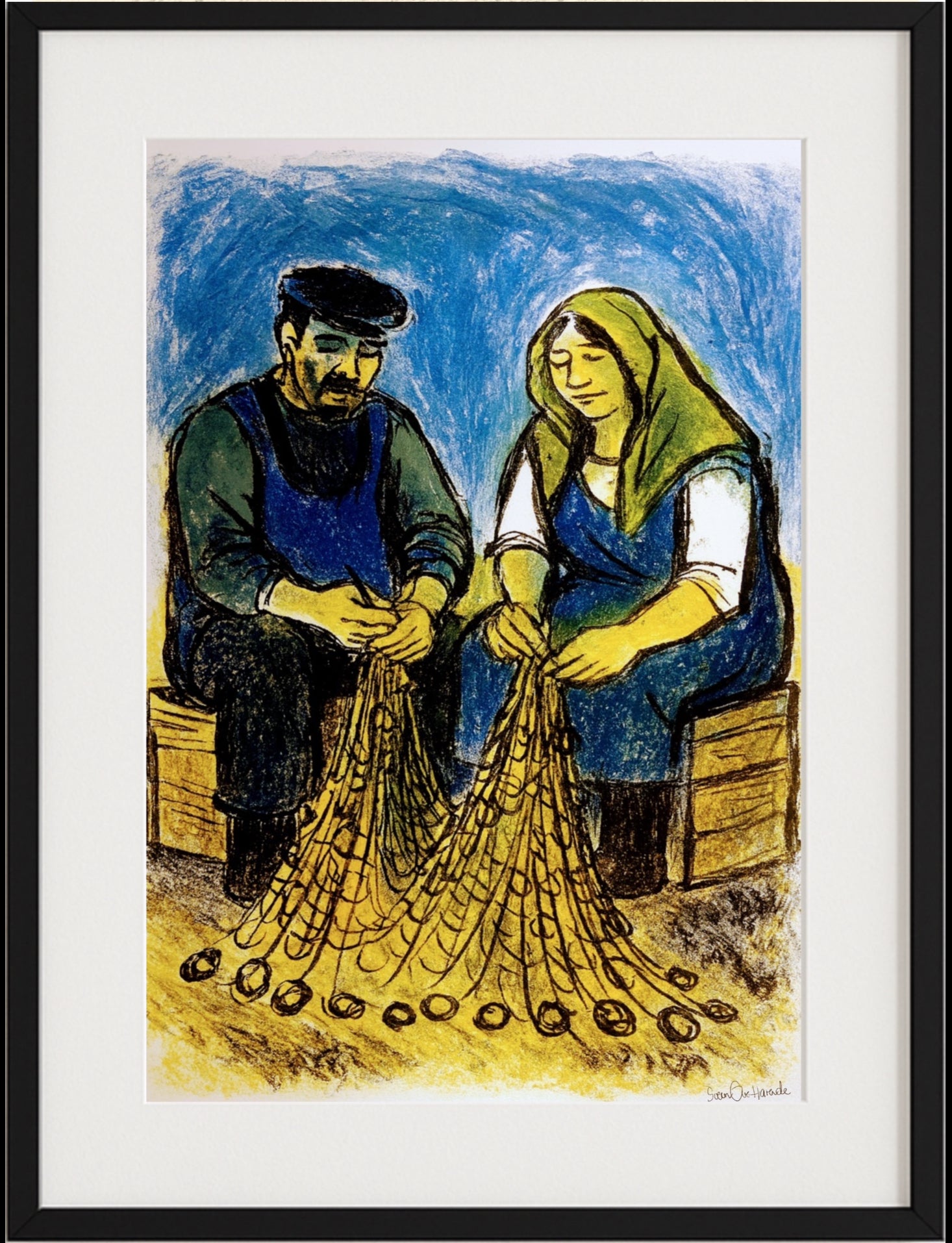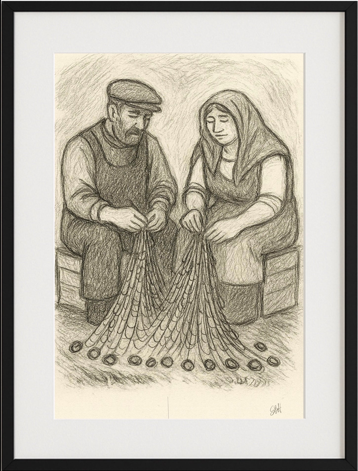 Et varmt og tidløst motiv som fanger et øyeblikk av ro og fellesskap. En fisker sitter side om side med sin kone, stille opptatt med å reparere garnene sine. De deler både arbeid og stillhet – et lite stykke hverdagsliv fra kysten, der samhold og rytmen i det enkle arbeidet binder menneskene sammen.